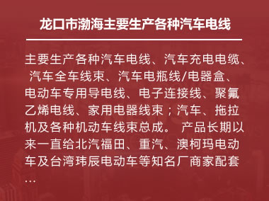我公司系山東省龍口市民營(yíng)企業(yè),全公司總占地面積72畝,建筑面積18000平方米,固定資產(chǎn)3000萬(wàn),專(zhuān)業(yè)生產(chǎn)設(shè)備150余臺(tái)套,檢測(cè)設(shè)備20余臺(tái)套,技術(shù)力量雄厚,檢測(cè)手段齊全。主要生產(chǎn)各種汽車(chē)電線(xiàn)、家用電器線(xiàn)束、汽車(chē)充電電纜、 汽車(chē)全車(chē)線(xiàn)束、汽車(chē)電瓶線(xiàn)/電器盒、電動(dòng)車(chē)專(zhuān)用導(dǎo)電線(xiàn)、電子連接線(xiàn)、聚氟乙烯電線(xiàn);汽車(chē)、拖拉機(jī)及各種機(jī)動(dòng)車(chē)線(xiàn)束總成。 我公司所有產(chǎn)品已通過(guò)國(guó)際TS16949認(rèn)證,產(chǎn)品長(zhǎng)期以來(lái)一直給北汽、重汽、海信、海爾、澳柯瑪?shù)戎麖S(chǎng)商配套。